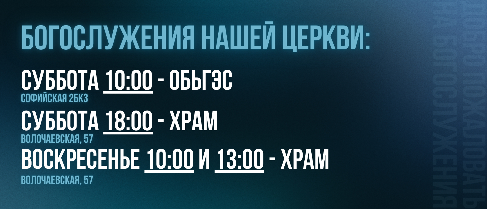 ЦЕРКОВЬ – это место для всех! Это Дом Божий здесь на земле. Здесь каждый может найти принятие, любовь и поддержку. Церковь – это место, где мы можем быть ближе к Богу, можем духовно расти. В церкви мы можем служить и помогать другим людям. Церковь – это место, где мы можем найти настоящих друзей и обрести семью.